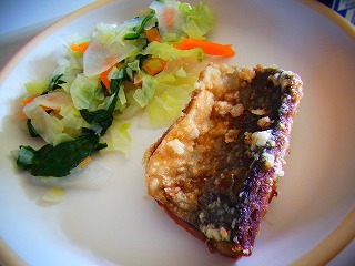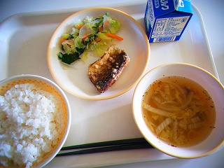 【11月20日(木)】今日のメニューは、ごはん、サバのソースがけ、ドレッシングサラダ、ウインナーと白菜のスープ、牛乳でした。