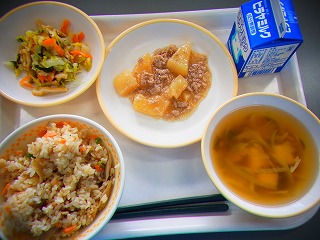 【11月21日(金)】今日のメニューは、鶏ごぼうごはん、聖護院大根のそぼろ煮、白菜の炊いたん、ゆばのすまし汁、牛乳でした。