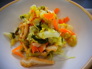 【11月18日(火)】今日のメニューは、ごはん、厚揚げのねぎみそ焼き、小松菜のゆかり和え、オニオンスープ、牛乳でした。