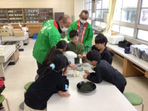 11月25日(火)3年生を対象に、お茶の飲みくらべ体験の出前授業がありました。子どもたちは、煎茶や甜茶などお茶には色々な種類があることを知ったり、温度によってお茶の味が変わることに驚いたりしていました。講師の皆さま、ありがとうございました。